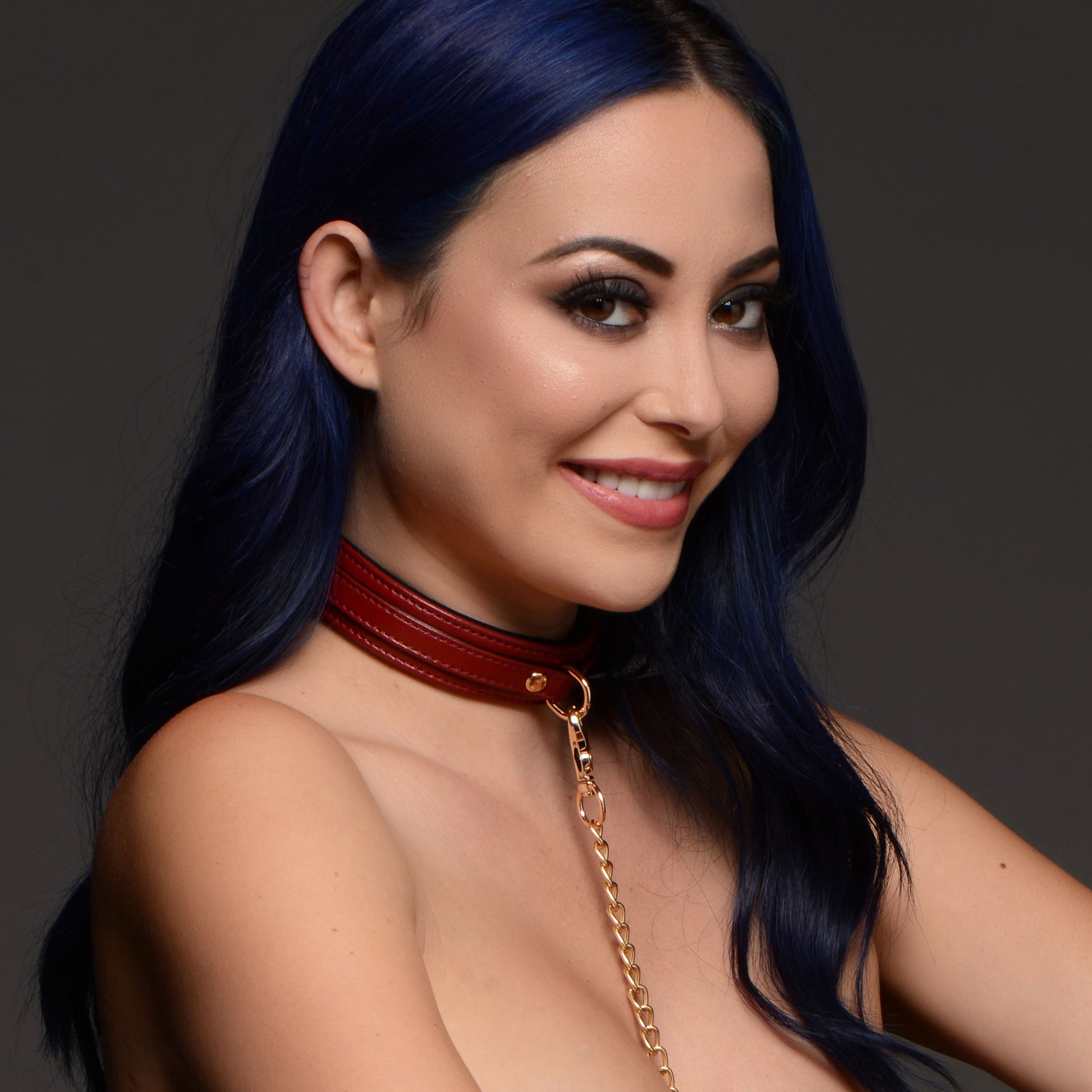 Enjoy the rich Burgundy color of these stylish restraints with a classic leather look! Made of PU leather, it is vegan friendly and easy to clean. Play with your sensual side as you slip on the restraints yourself or have your partner place you in bondage cuffs and nothing else! Show your sassy submissive side with stylish and sensual burgundy and gold restraints! Tease your partner as you gently pull against the cuffs and chains, hold the leash in your mouth or let them take you for a walk as their prized pet! Use any of the 5 D-rings to attach the golden chains or any other attachments. Each strap is adjustable via buckles and straps. All metal is nickel free and body safe.