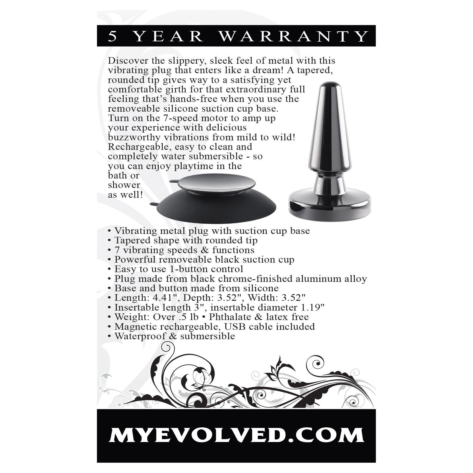 Discover the slippery, sleek feel of metal with this vibrating plug that enters like a dream! A tapered, rounded tip gives way to a satisfying yet comfortable girth for that extraordinary full feeling that's hands-free when you use the 2-sided silicone suction cup base. Turn on the 7-speed motor to amp up your experience with delicious buzzworthy vibrations from mild to wild! Rechargeable easy to clean and completely water submersible - so you can enjoy playtime in the bath or shower as well!