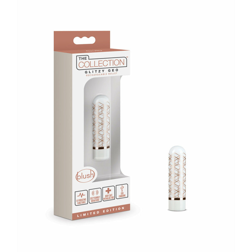 The Collection Glitzy Geo Bullet's strength will shine! Geo's Rose Gold accents bring style to your playtime. Discover 10 powerful vibration functions packed inside Glitzy Geo's compact body. Discreet, simple to store, and a perfect travel companion! Glitzy Geo is rechargeable, body safe, splashproof, and easy to clean.