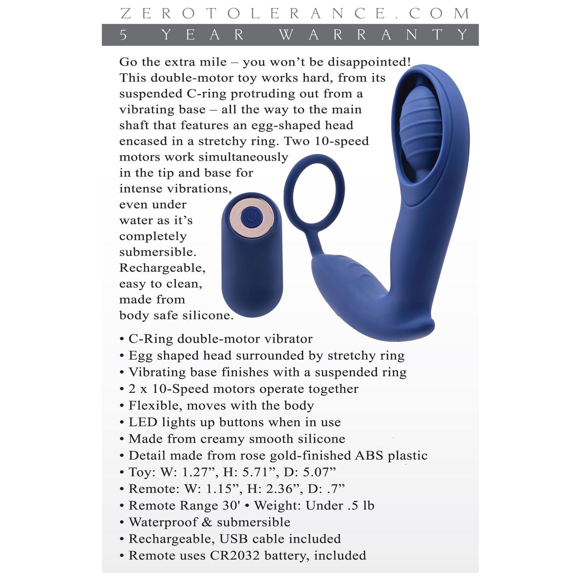 Go the Extra Mile - you won't be disappointed! This double-motor toy works hard, from its suspended C-ring protruding out from a vibrating base all the way to the main shaft that features an egg-shaped head encased in a stretchy ring. Two 10-speed motors work simultaneously in the tip and base for intense vibrations, even under water as it's completely submersible. Rechargeable, easy to clean, made from body safe silicone.