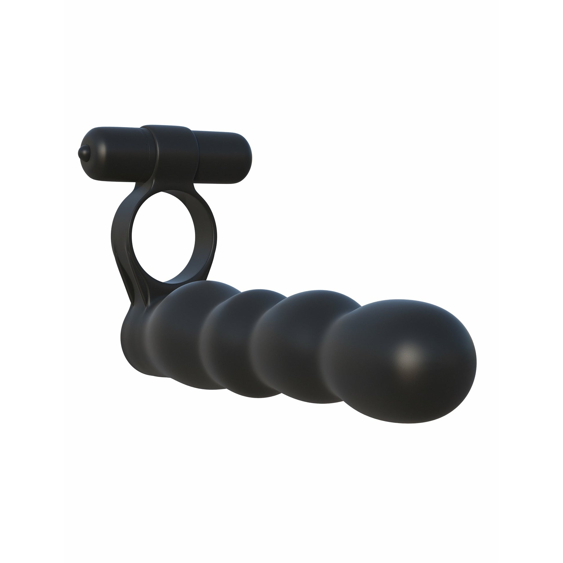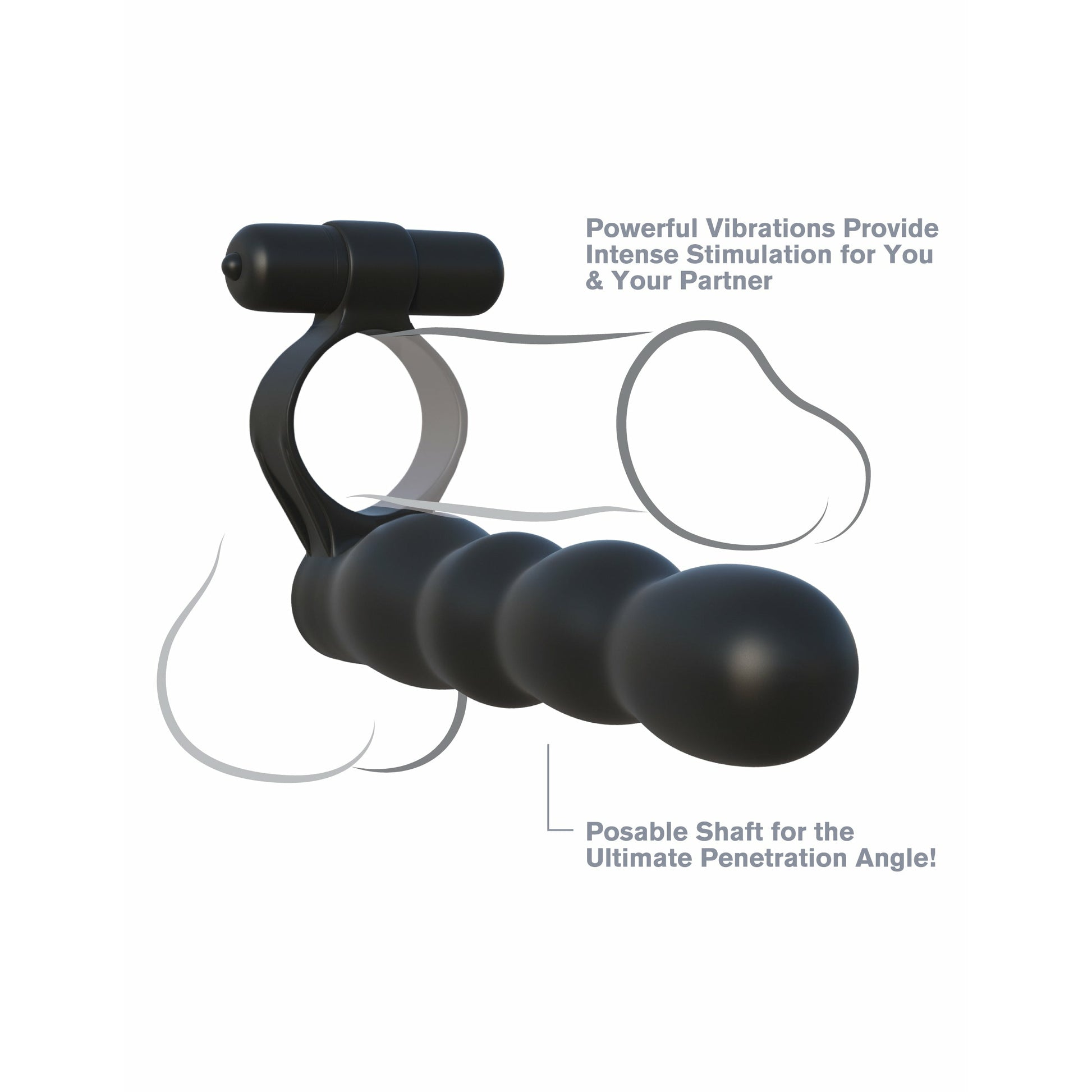 Double the pleasure and double the fun with the incredible Posable Partner Double Penetrator! Now you both can enjoy the thrill of double penetration without having to worry about introducing a third partner into the mix! Made from body-safe, phthalate-free Elite Silicone, this posable penetrator features a bendable silicone stimulator that stays in place in any position you put it. The stretchy silicone cock ring puts a clamp on performance letdowns by delivering a tight squeeze to his shaft, while the beaded posable exciter provides extra stimulation during double penetration. Wear the ring on your shaft and pick a hole the bendable teaser can be used vaginally or anally for equally amazing results. The built-in vertebrae allow you to pose it in any position, targeting your partners most sensitive spots with every thrust. The vibrating ring keeps him longer and stronger than ever before while you both enjoy mind-blowing vibrations where you want them most! Try it in the shower or hot tub and turn bath time into pleasure time. Cleanup is a snap after the fun with toy cleaner and warm water. Use plenty of Moist to ensure a wet and wild encounter!