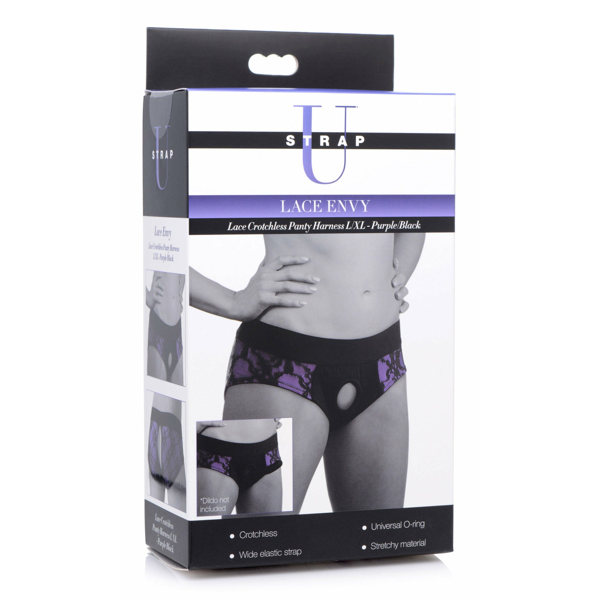 Lace Envy Crotchless Panty Harness - L/ XL Purple and Black