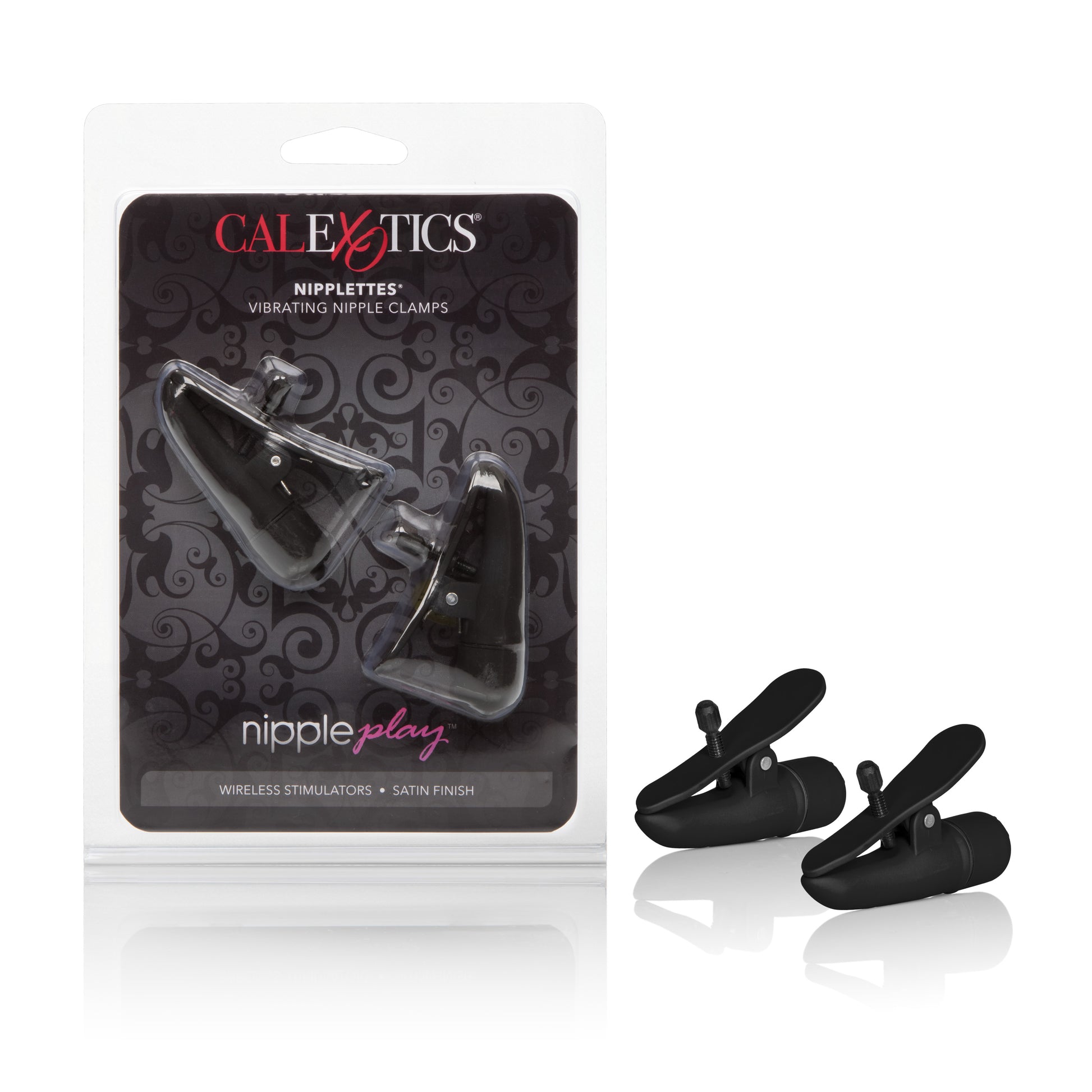 Nipplettes vibrating nipple clamps include 2 multi-use fully adjustable designer clamps. High intensity wireless motor with easy push button control. Waterproof for use everywhere!