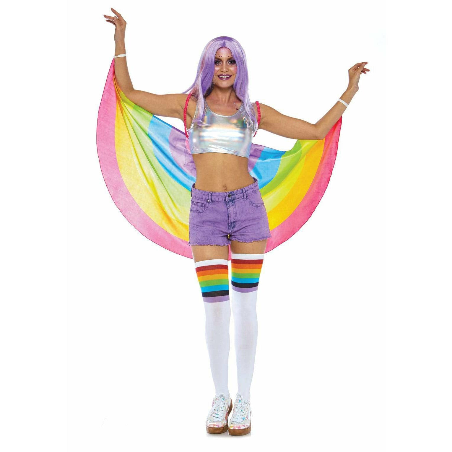 From Pride to summer festival season, add a vibrant vibe to any look with the Leg Avenue Rainbow Wings. The cute and colorful festival wings feature a vibrant rainbow pattern and flowing semi-circle design. For comfort and ease of wear, these wings are complete with stretchy elastic back straps and wrist straps. For a Pride-Ready look, pair these bold wings with the Leg Avenue 2-Piece Holographic Metallic Spandex Bandeau and Shorts set and the Multi Color Jovi Face Jewels. Perfect for Halloween, DIY theme costumes, music festival, theater props or dance wear.