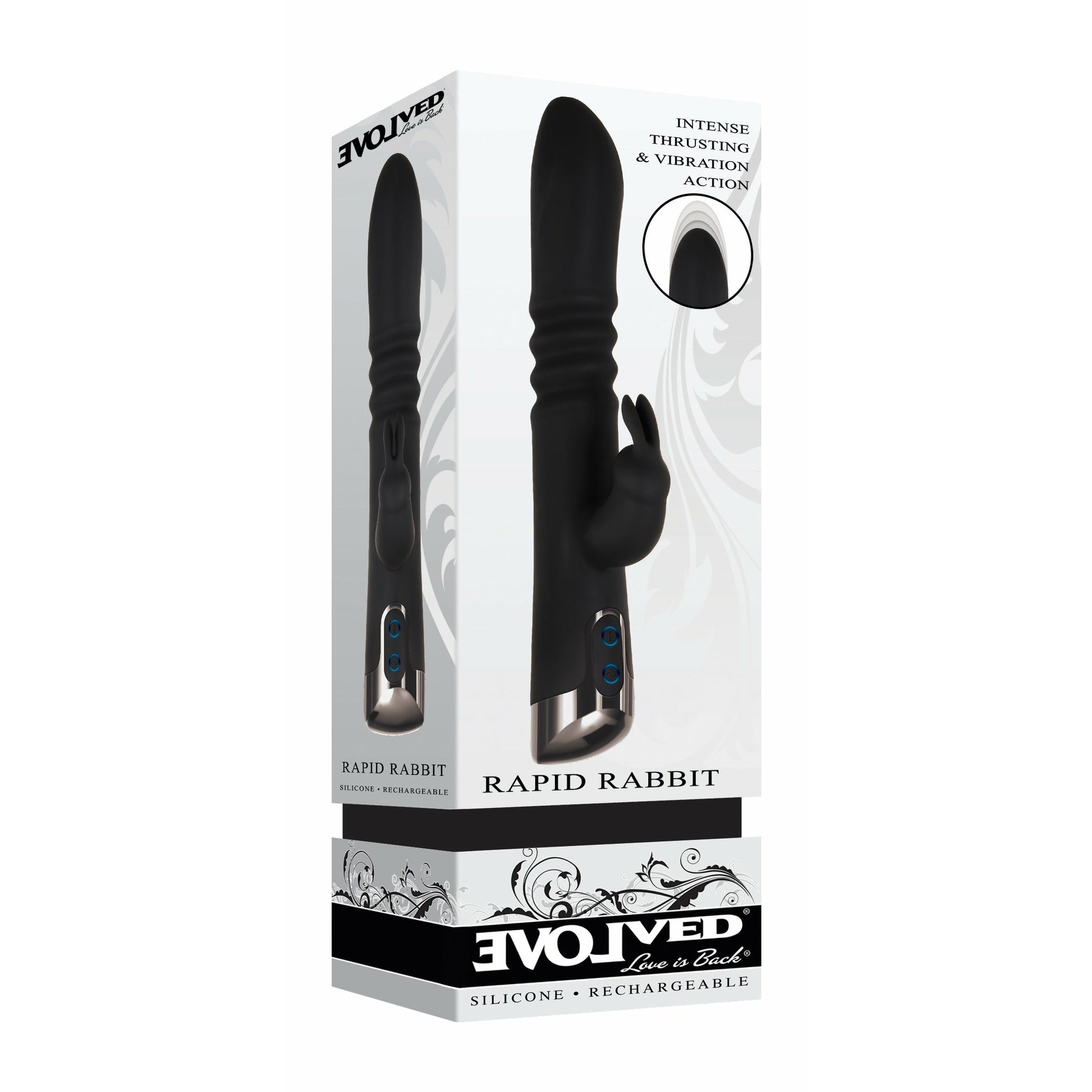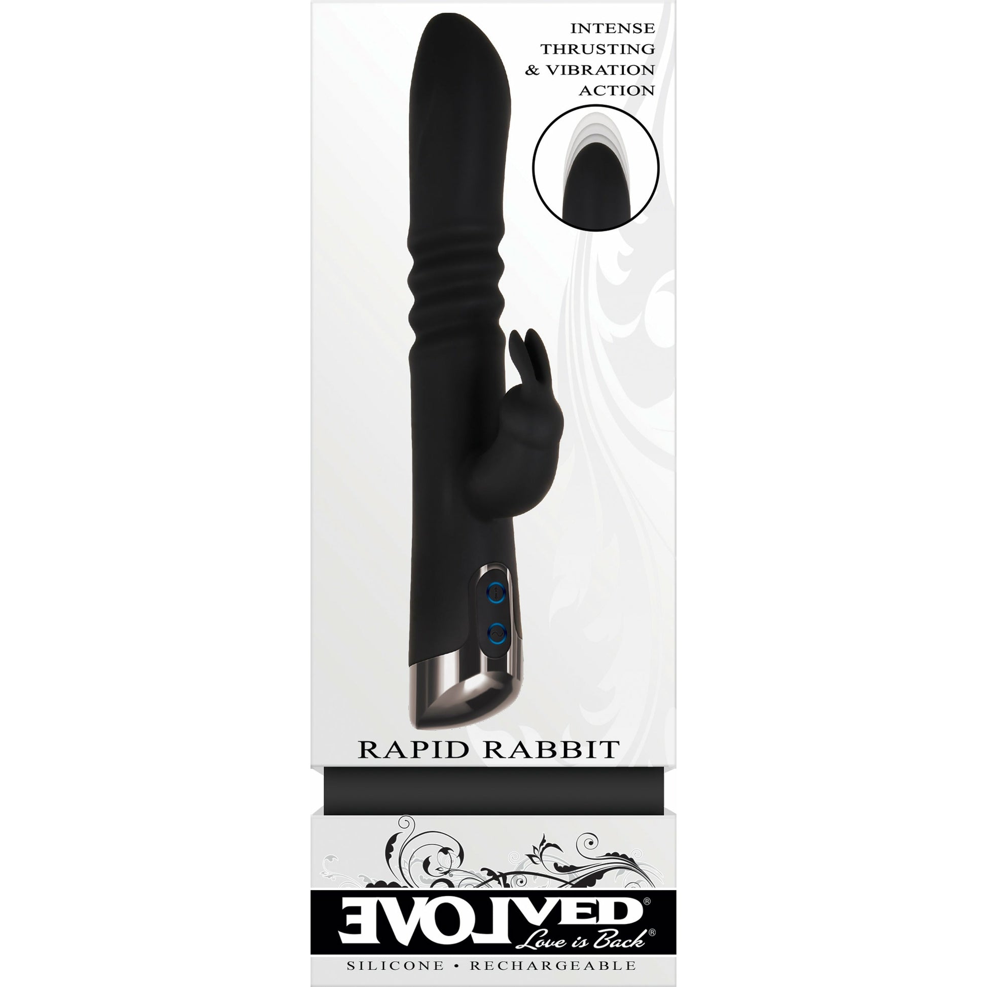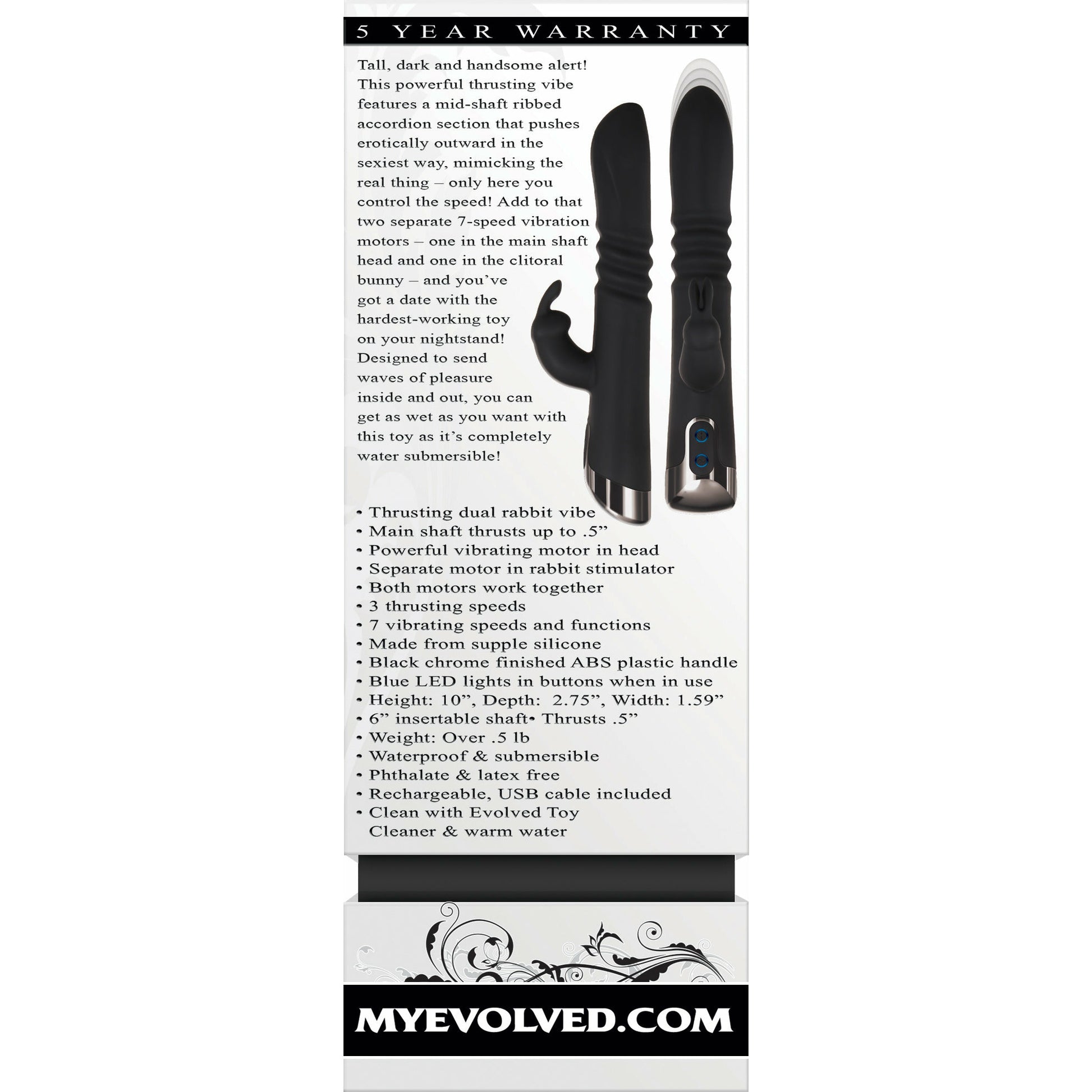Tall, dark and handsome alert! This powerful thrusting vibe features a mid-shaft ribbed accordion section that pushes erotically outward in the sexiest way, mimicking the real thing, only here you control the speed! Add to that two separate 7-speed vibration motors, one in the main shaft head and one in the clitoral bunny, and you've got a date with the hardest-working toy on your nightstand! Designed to send waves of pleasure inside and out, you can get as wet as you want with this toy as it's completely water submersible!