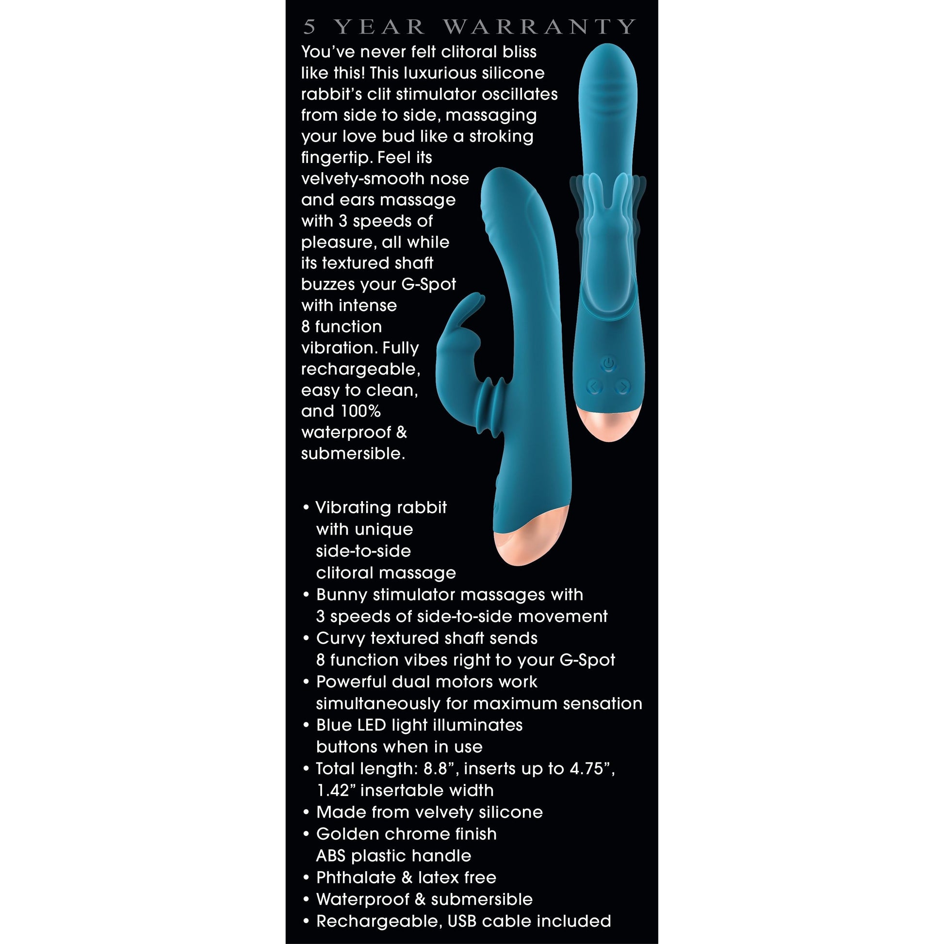 You've never felt clitoral bliss like this! This luxurious silicone rabbit's clit stimulator oscillates from side to side, massaging your love bud like a stroking fingertip. Feel its velvety-smooth nose and ears massage with 3 speeds of pleasure, all while its textures shaft buzzes your G-Spot with intense 8 function vibration. Fully rechargeable, easy to clean, and 100% waterproof and submersible.