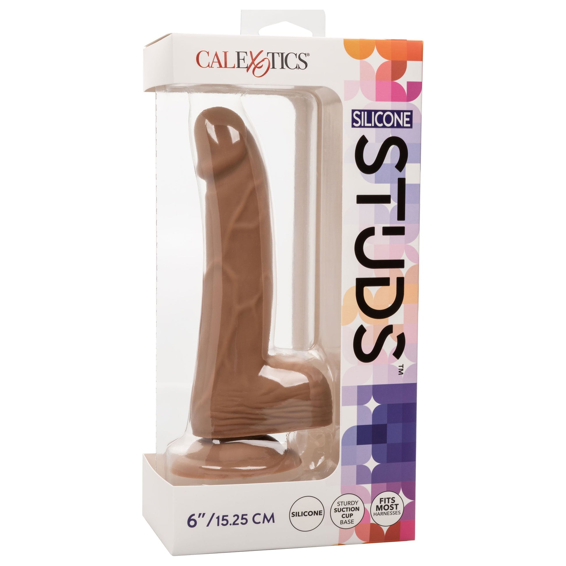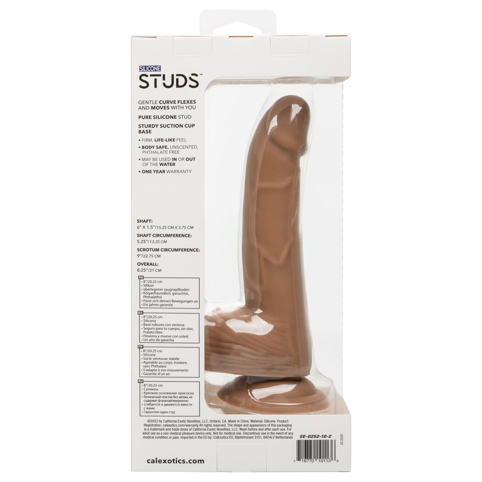 You're all about the size of your pleasure and the CalExotics Silicone Studs 6" (15.25 cm) has arrived to deliver a pounding experience fit for any size queen. The real-feel dong is crafted with an ample 6-inch (15.25 cm) shaft, realistic flexible design, and suction cup base. Deliver the pleasure you've been craving with a 6-inch (15.25 cm) long dong with sensual tip, textured shaft, and life-like balls. The textured shaft has a firm, yet flexible feel sure to deliver a truly realistic penetration experience. The flanged base has a sturdy suction cup that can be used in a harness or mounted to a flat surface for sensational hands-free fun.