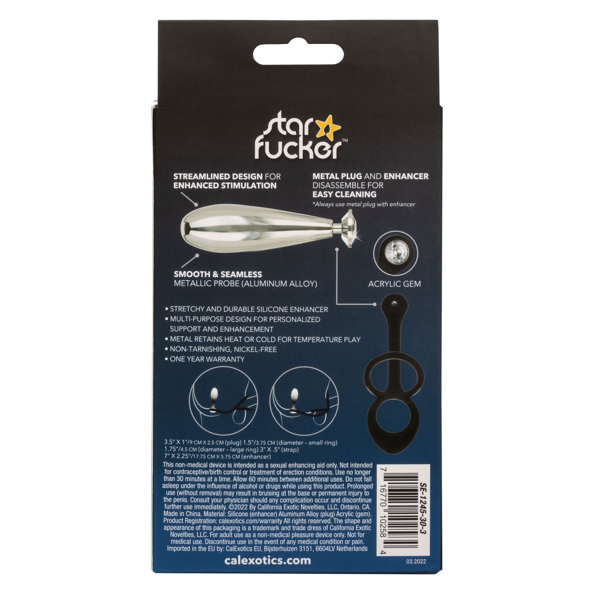 Blast off to a universe of personalized pleasure with the Star Fucker Glider Plug. A stretchy, silicone dual enhancer is paired with a sleek, seamless metal probe for versatile support, enhancement, and even tantalizing temperature play. The supple silicone dual enhancer was created to increase stamina, improve sensitivity and deliver superior erection support. Get playful by using the dual enhancer and metallic probe together, and don't forget they can be disassembled for easy cleaning. The flexible probe is made from a smooth, seamless aluminum alloy that retains heat or cold for a one-of-a-kind temperature play experience. While you expand your horizons with the sleek Glider plug, use the sparkling gem adorned base for steamy stimulation, effortless insertion and gentle removal. The view gets even better from behind with the sparkling gem base.