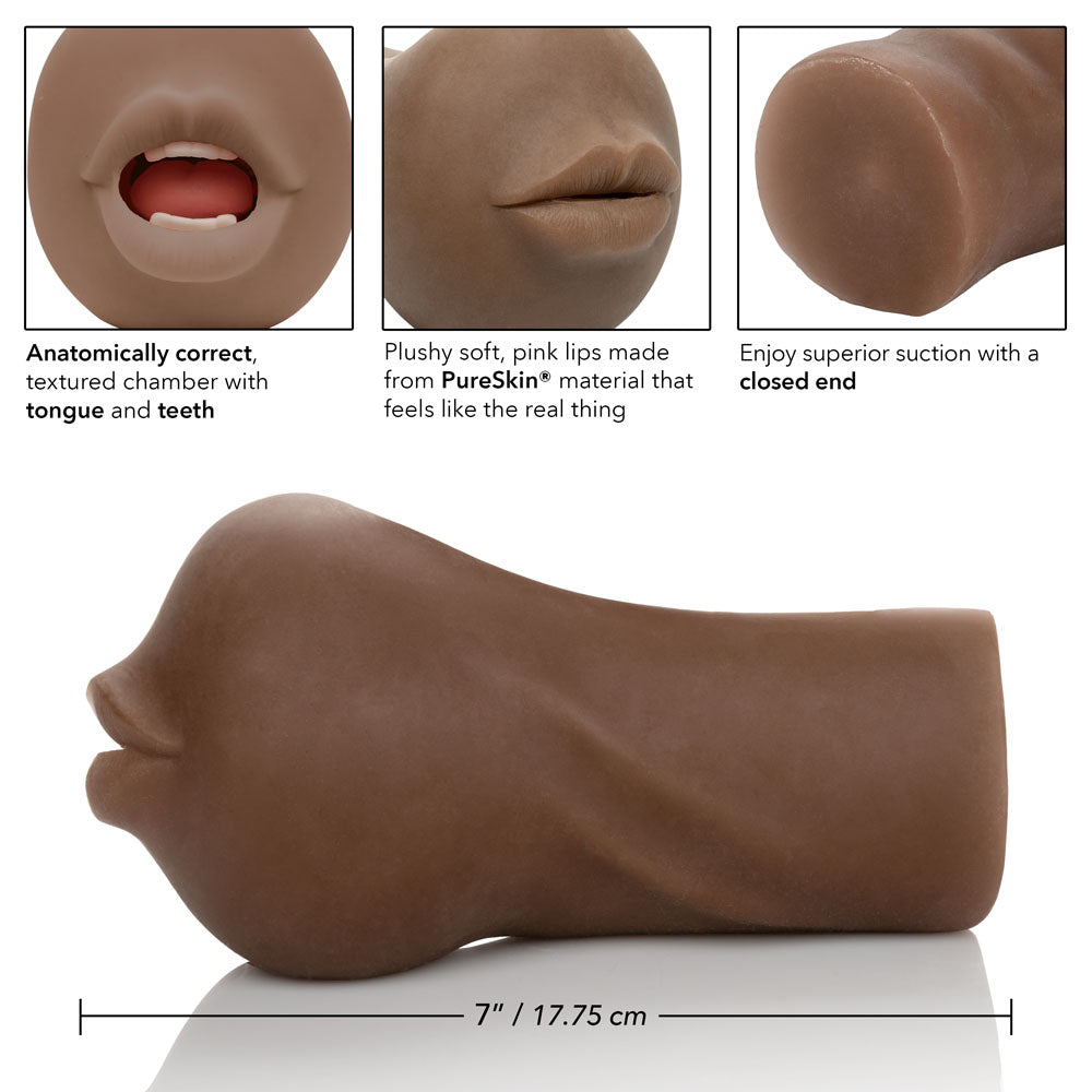 Over 1 lb / .45 kg of heavy-duty stroking pleasure. Ultra life-like Pure Skin material. Anatomically correct, textured chamber. Real mouth with tongue and teeth. Closed end for superior suction.