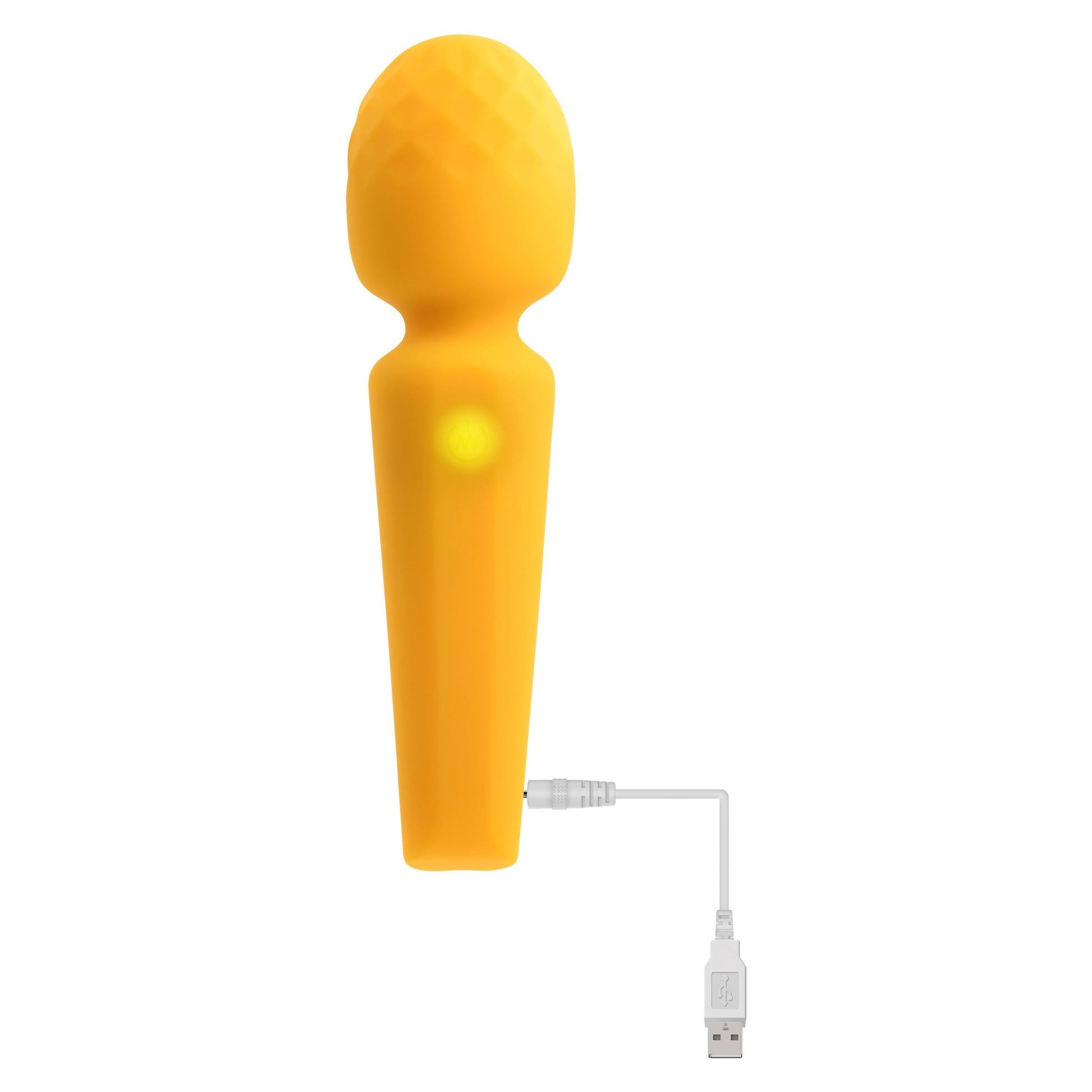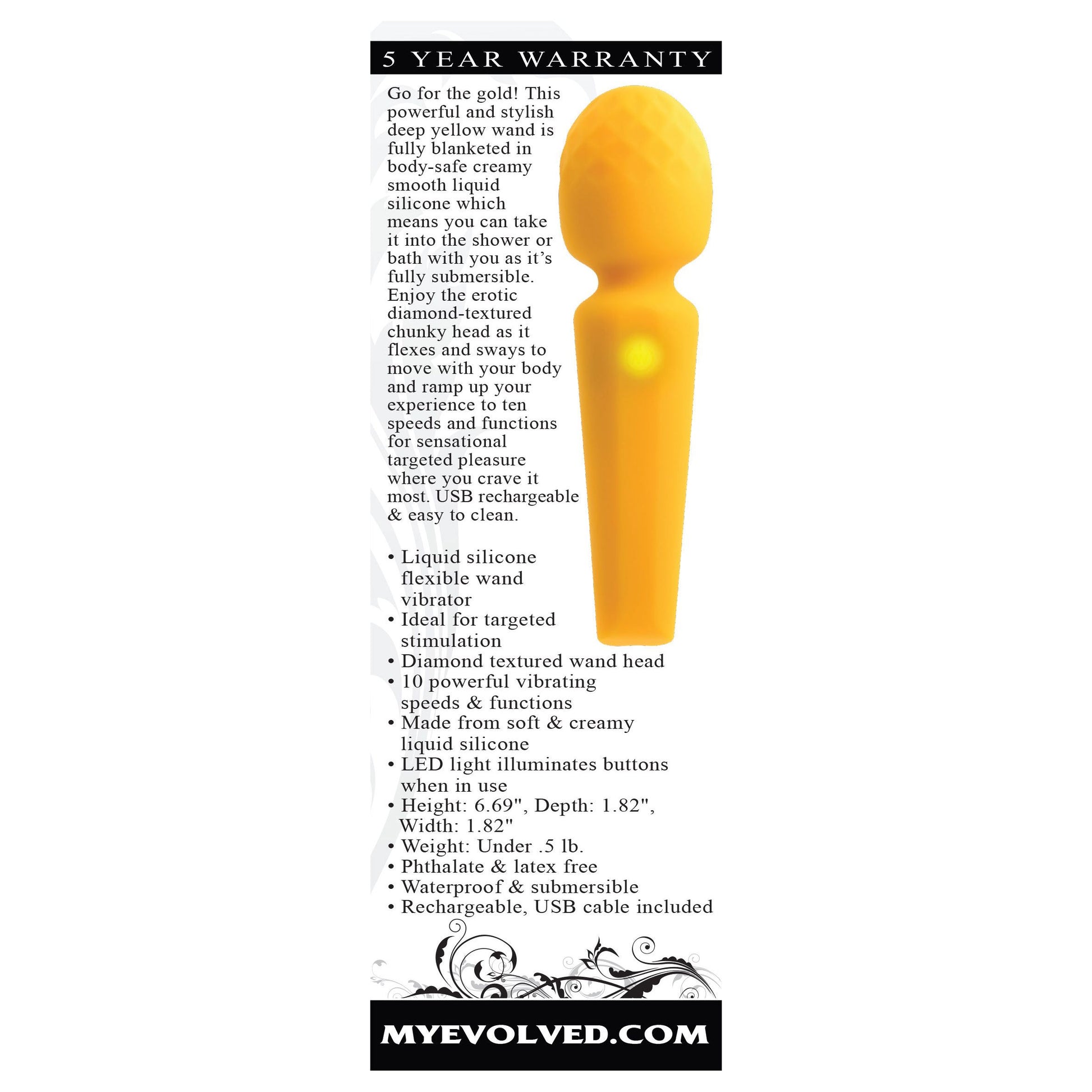 Go for the gold! This powerful and stylish deep yellow wand is fully blanketed in body-safe creamy smooth liquid silicone which means you can take it into the shower or bath with you as its fully submersible. Enjoy the erotic diamond-textured chunky head as it flexes and sways to move with your body and ramp up your experience to ten speeds and functions for sensational targeted pleasure where you crave it most. USB rechargeable and easy to clean.