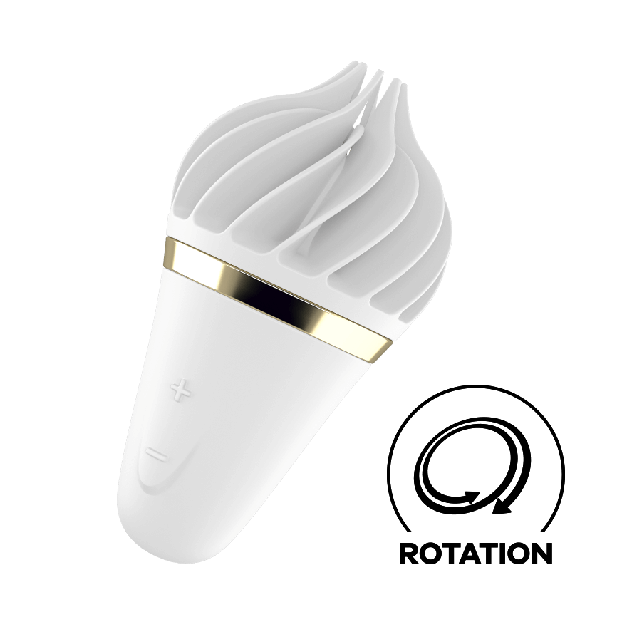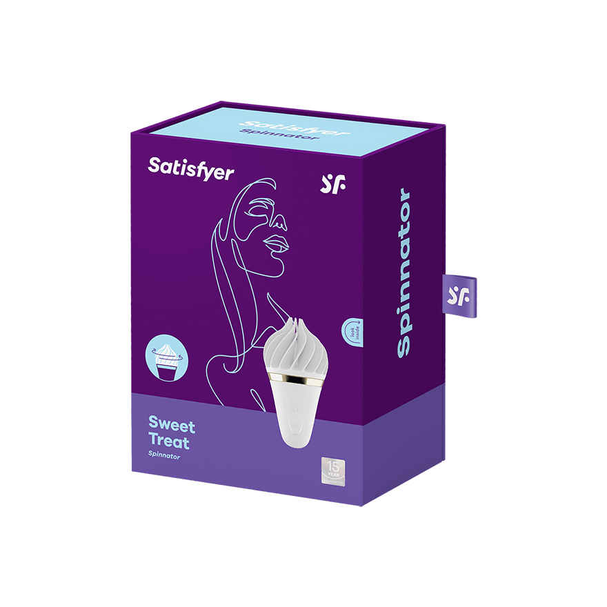 The Satisfyer Sweet Treat is probably the sweetest of all clit vibrators - because this ice cream cone has it all: It brings your clitoris to super sweet climaxes like never before with the rotating fins. Pleasantly soft, skin-friendly silicone nestles around your pleasure pearl and takes care of your sexual wellness with powerful devotion, no matter where you are. The seductive cone fits comfortably in your hand - so you can easily control the 10 exciting vibration levels, consisting of 4 rotation rhythms and 3 right and left speeds each, using the +/- buttons.
