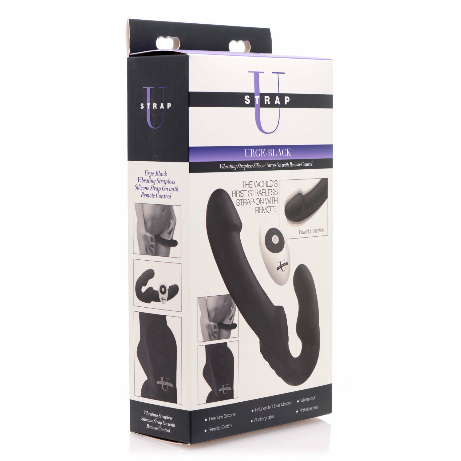 The first strapless strap-on with a remote control in the world, this couple's toy provides more convenient vibrating pleasure during pegging or penetration that does not involve a penis. The shape allows one partner to insert the smaller end vaginally, holding it with their Kegel muscles or adding a harness for extra support. A pad with ridges provides clitoral bliss as they grind against it. Meanwhile, every thrust will send the long, smooth shaft into their partner. The curves on both ends target the G-spot or via the panel on the front of the Urge, or with the handy remote control! Explore 3 speeds of buzzing and 5 patterns of pulsation for each partner. It is even waterproof for wet, hot fun in the bath, shower, or pool. Made of premium silicone, the Urge is non-porous, phthalate-free, and thoroughly sanitized with mild soap and warm water. Preserve the material by avoiding use with silicone lubricant.